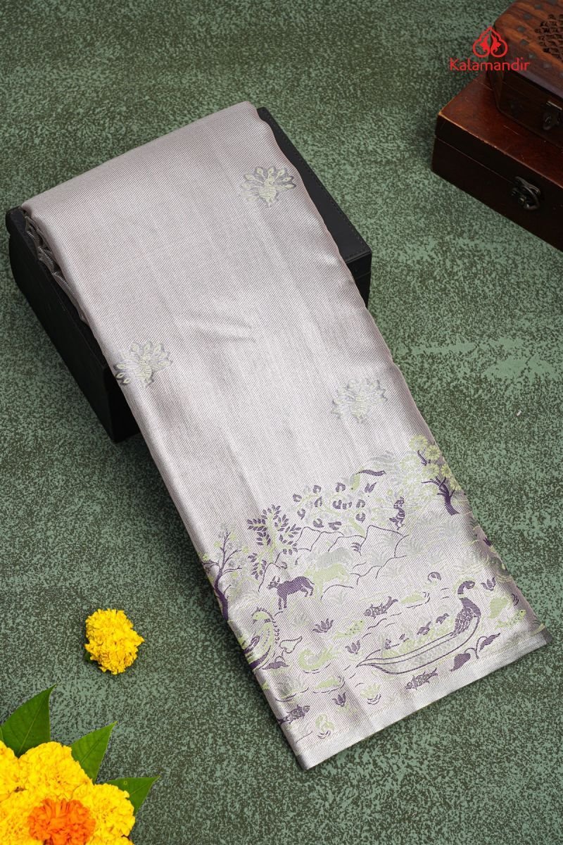 SILVER and BROWN PEACOCK BUTTIS SILK BLEND Saree with SEMI PATTU