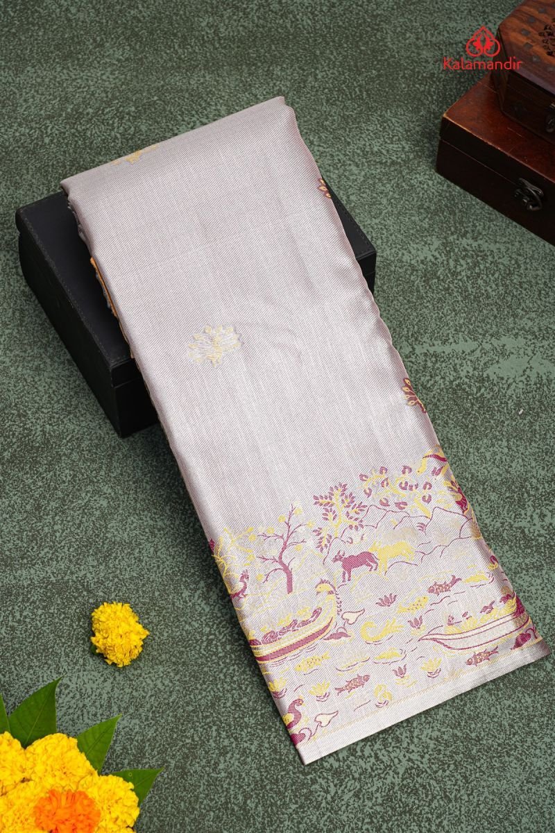 SILVER and BROWN & YELLOW PEACOCK BUTTIS SILK BLEND Saree with SEMI PATTU