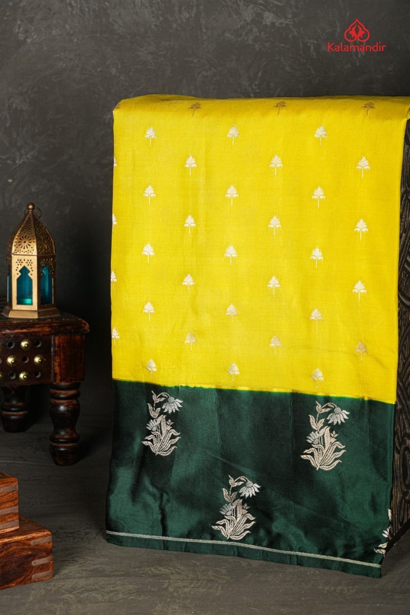 LEMON YELLOW and DARK GREEN ZARI BUTTIS SILK Saree with BANARASI